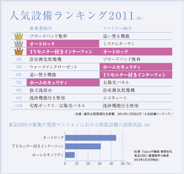 空き巣やストーカーの犯罪が多発する中、マンションへの防犯対策は欠かすことができません。さて何から、と考えた時にまず頭に浮かぶのは、エントランスのオートロックやTVモニター付きインターフォンなどでしょう。これらは「人気設備ランキング」でもベスト10内に入っており(表1)、いまや「付いていて当たり前」とされる設備になりつつあります。とはいえ、実際に設置されている賃貸マンションはまだ十分な数とはいえず(表2)、早急な取り組みが必要です。