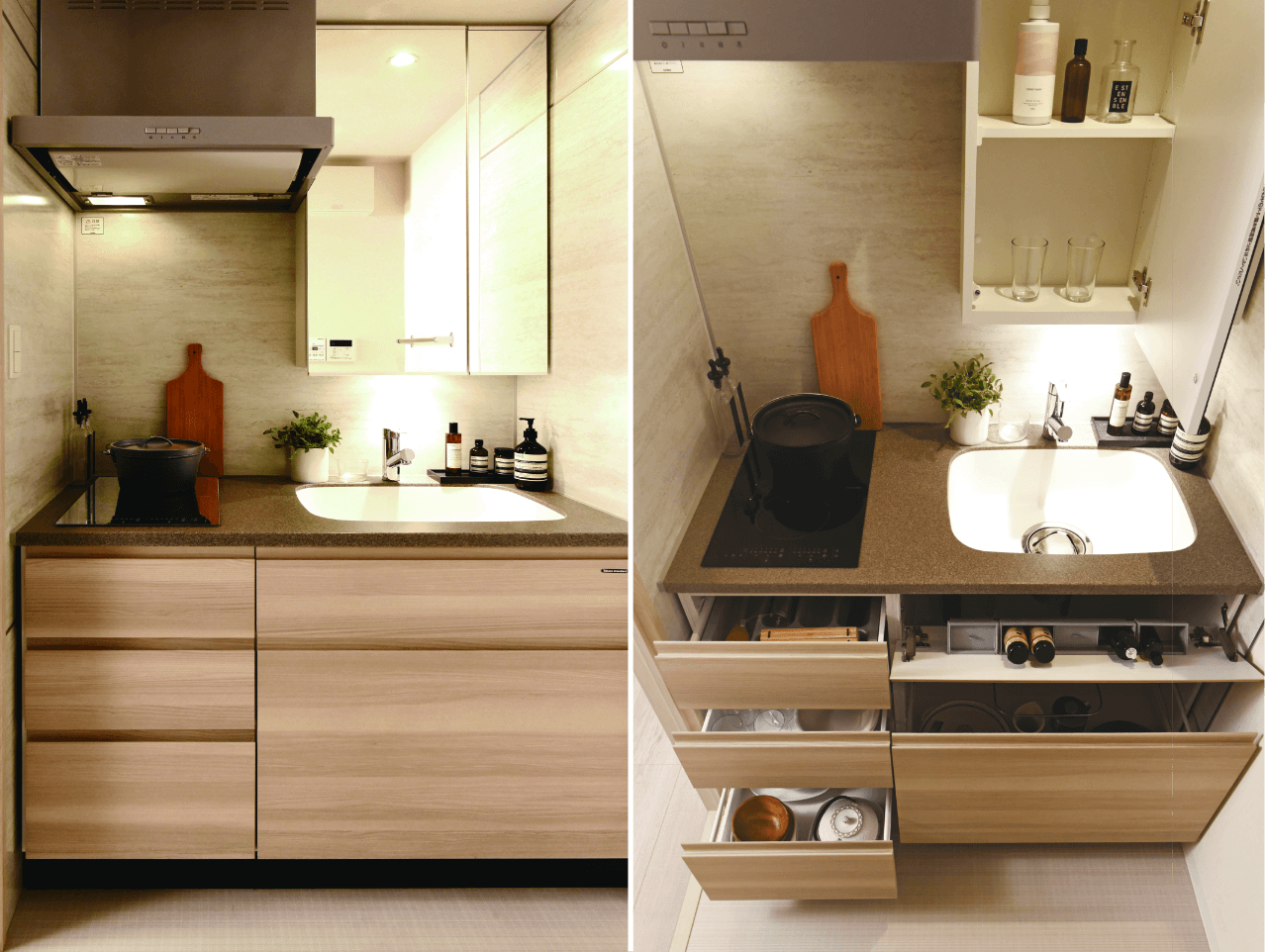 キッチン&洗面用品をたっぷり収納できる、生和コーポレーションのキッチン洗面一体型システム。