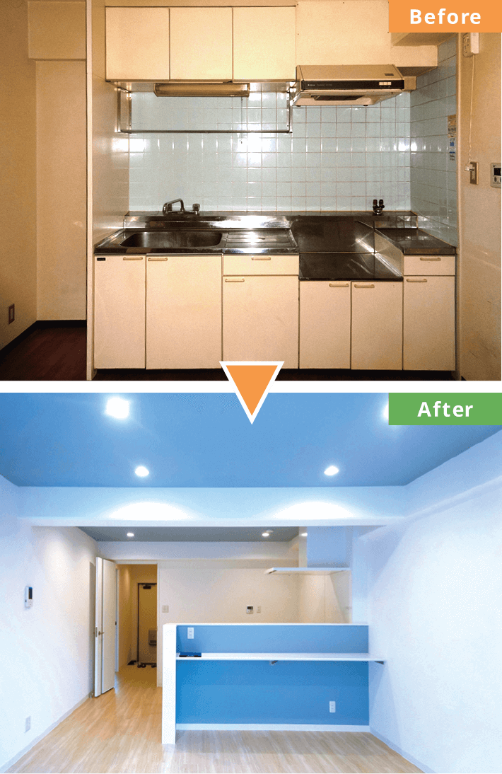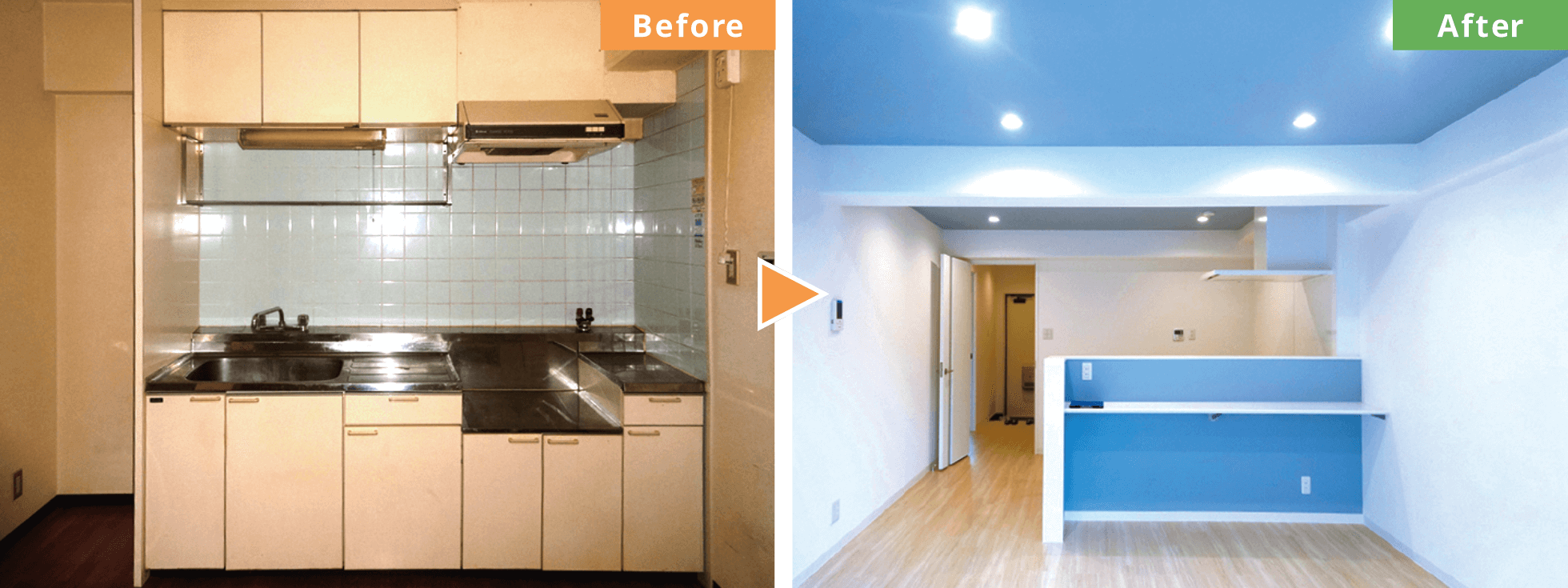 白とブルーを基調とした心地よい空間が高い評価を得て、賃料3割アップも実現しました。