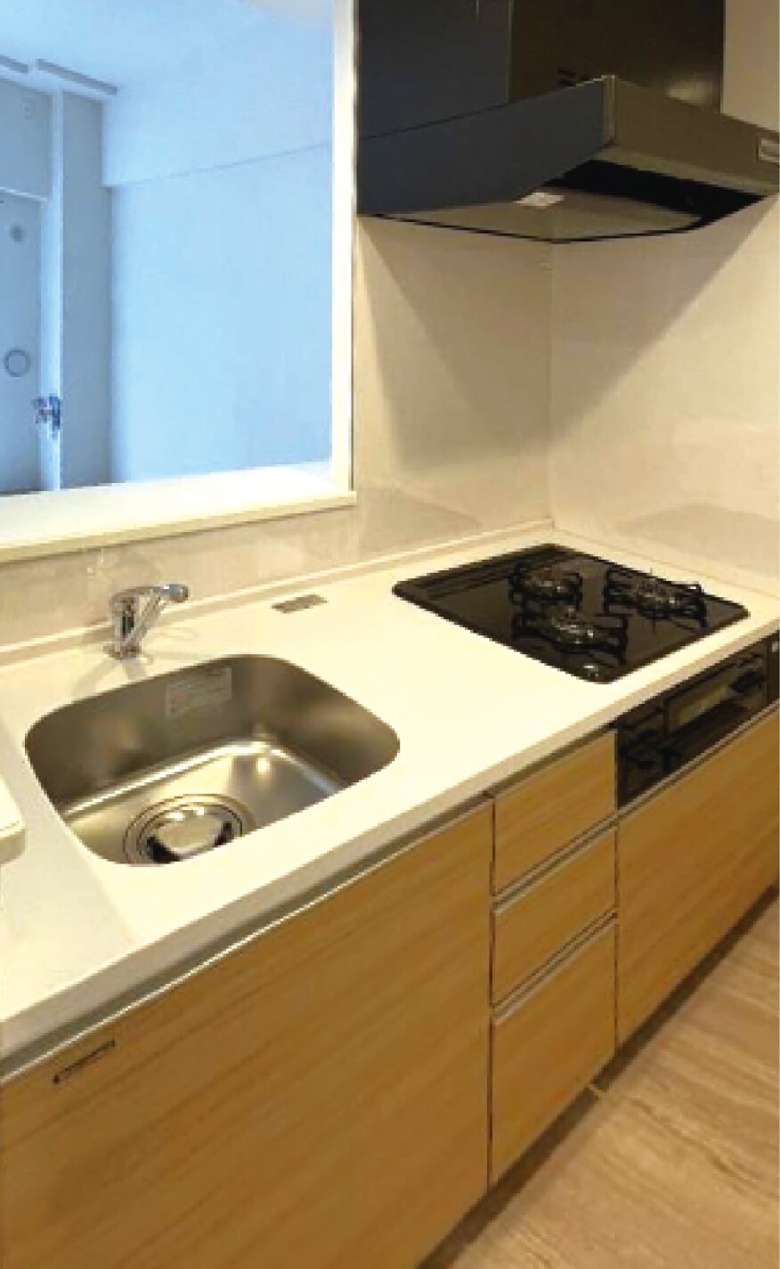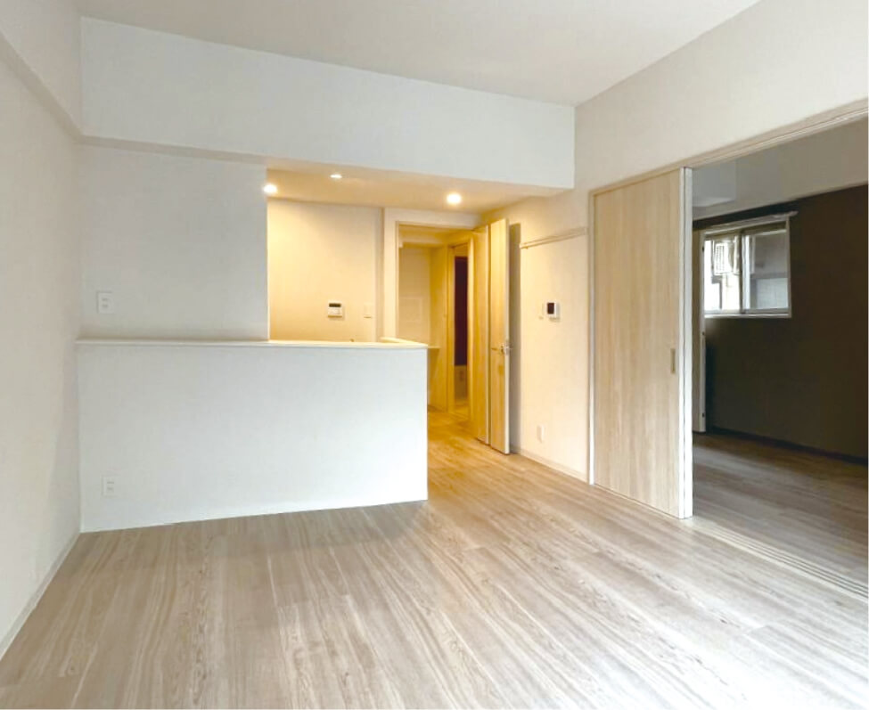 対面式のシステムキッチンがある1LDK。