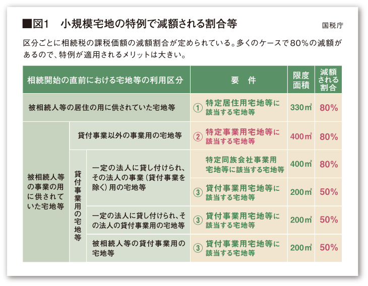 「小規模宅地等の特例」の正式名称は「小規模宅地等についての相続税の課税価格の計算の特例」です。これは、亡くなった人の自宅の土地や、亡くなった人が事業に使っていた土地(店舗や事務所用の土地など)を相続する場合、宅地の評価額を最大80%減額する制度。評価額が下がることで大幅な節税が期待できます。