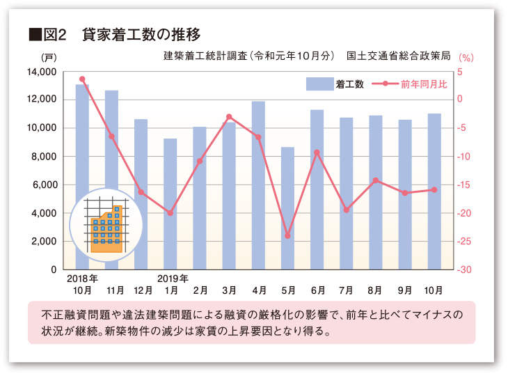 家賃の変動が起きにくい理由は、住まいがなくてはならない生活基盤だからです。もちろん衣食も必須のものですが、短期的な支出のコントロールが可能なので、景気などの影響を受けやすい点が異なります。家賃は人口や供給戸数に左右される部分が大きく、景気の動向とはリンクしない場合が多いのです。現在、新築物件の減少が家賃を押し上げているという分析もあります。(図2参照)