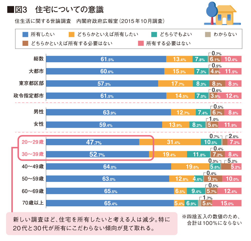 アパート・マンション経営が不景気に強いとされている理由には、住宅購入意欲の低下も挙げられます。国土交通省が行った意識調査によると、「土地・建物を所有したい」と答えた人の割合が74.6%と、4年連続で低下。一方、賃貸住宅で構わないと回答した人の割合は4年連続で上昇し、調査開始以来最も高い17.8%という結果になりました。内閣府の世論調査でも同様の結果が得られており、特に若年層の所有意欲が低いと指摘されています。(図3参照)