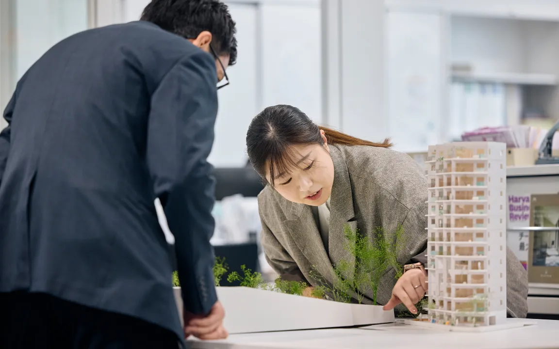 生和の実施設計は、あえて最低限のマニュアルしかありません。上司や先輩が一つひとつアドバイスし、教えるスタイルです。図面上に書かれていることすべてに意味や意図があり、そこまで理解した上で設計するようにと教えられています。また、協力会社との円滑なやり取りや図面を遅らせないための気遣いなど、言葉に乗らないような大切なことも沢山教えていただきました。また、挑戦する機会も多くいただき、入社間もない私に、先輩が「ここ考えていいよ」と一番の醍醐味である外観とエントランスのデザインを任せてくださり、並走しながら様々なことを教えていただきました。まだまだ追いつけない背中ですが、追い越せるよう頑張っています。