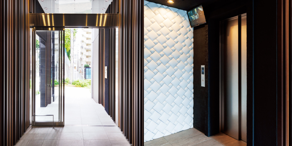 高級感漂うエントランス、様々なこだわりの材質を組み合わせている。エレベーターホールにはデザインタイルで壁に装飾を施した